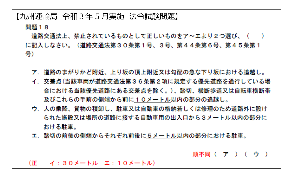 エ「踏切の前後の側端からそれぞれ前後に5メートル以内の部分における駐車」という肢がありました。この設問については、「5メートルの箇所が誤りで正しくは10メートル」というのが九州運輸局が発表した解答です。